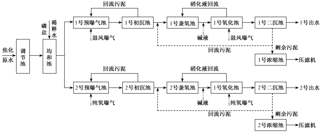 衛(wèi)源曝氣生化系統(tǒng)包括均質(zhì)調(diào)節(jié)池、均質(zhì)池、反硝化池、硝化池,還包括污泥處理系統(tǒng)和輔助系統(tǒng)(其它系統(tǒng)的進(jìn)料泵、儲(chǔ)藥系統(tǒng)、冷卻系統(tǒng)等未列入其它系統(tǒng)的單體設(shè)備)。